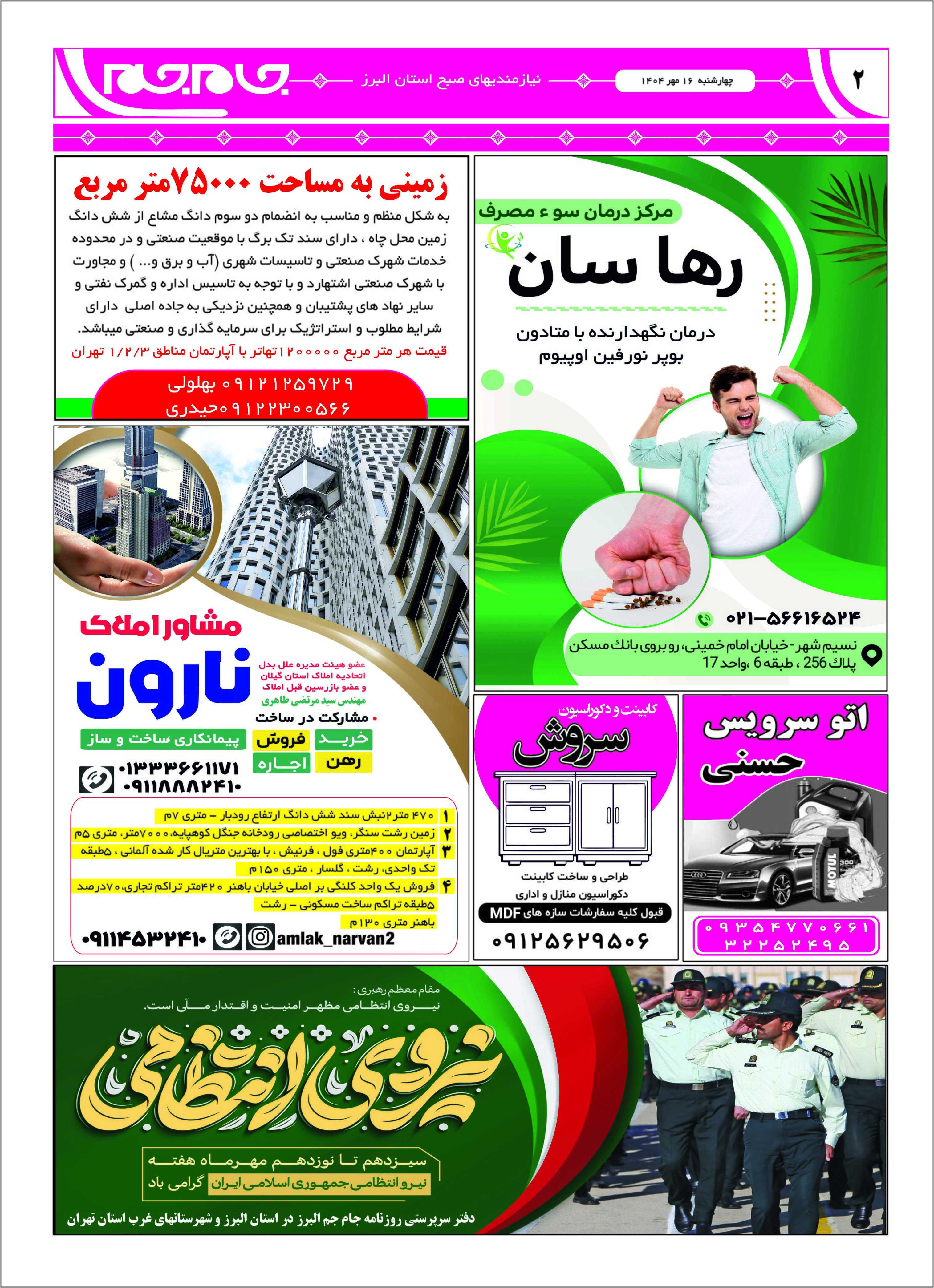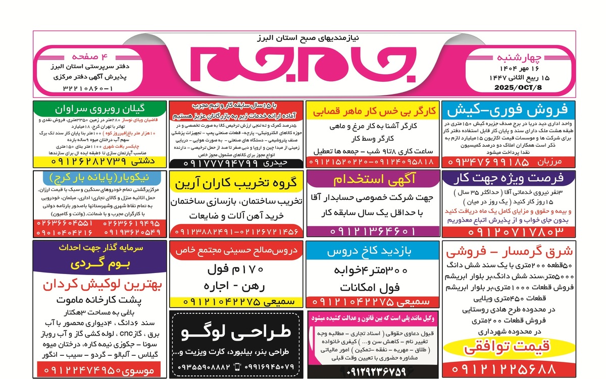 نیازمندی‌های روزنامه جام جم البرز ۱۶ مهرماه ۱۴۰۴