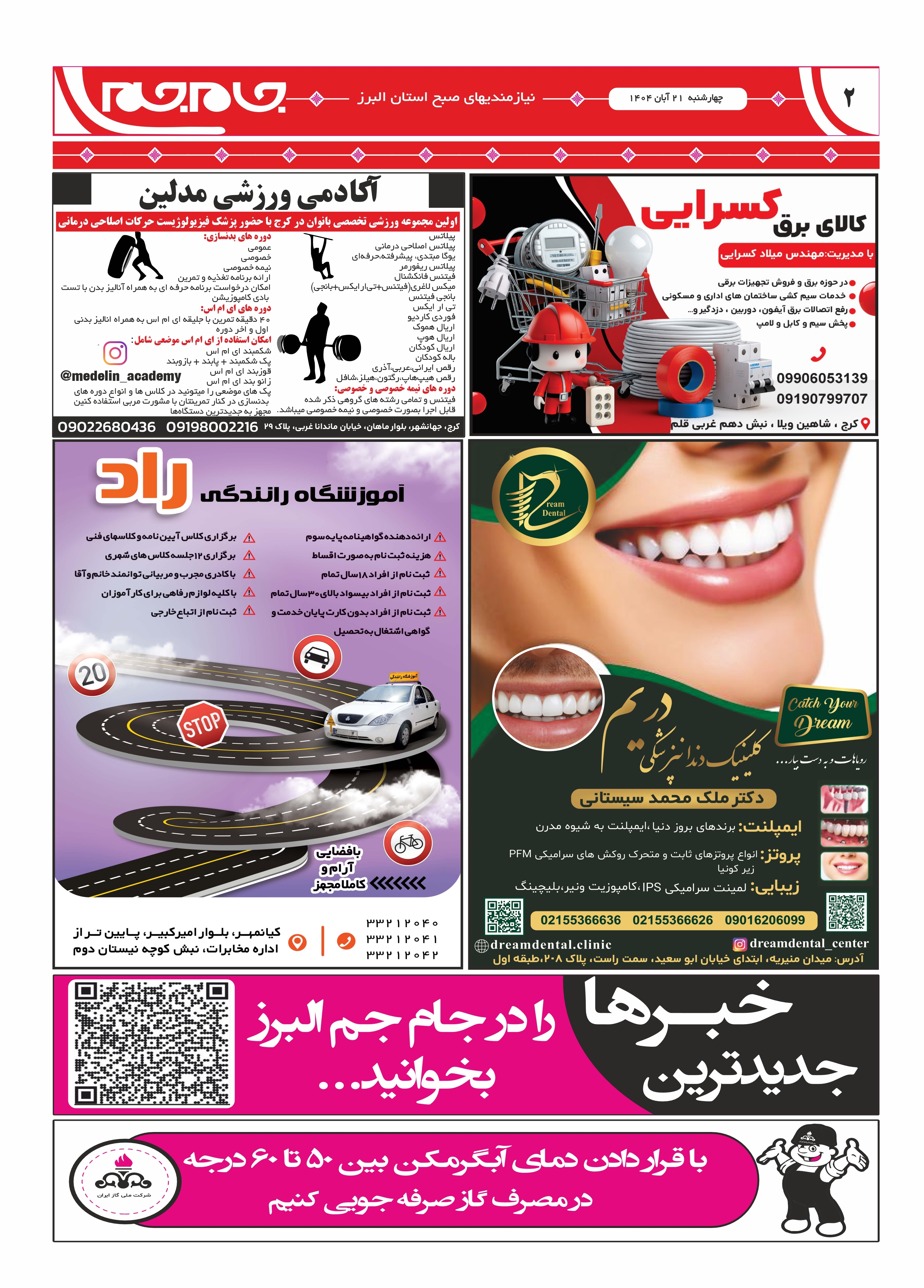 نیازمندی‌های روزنامه جام جم البرز ۲۱ آبان ماه ماه ۱۴۰۴