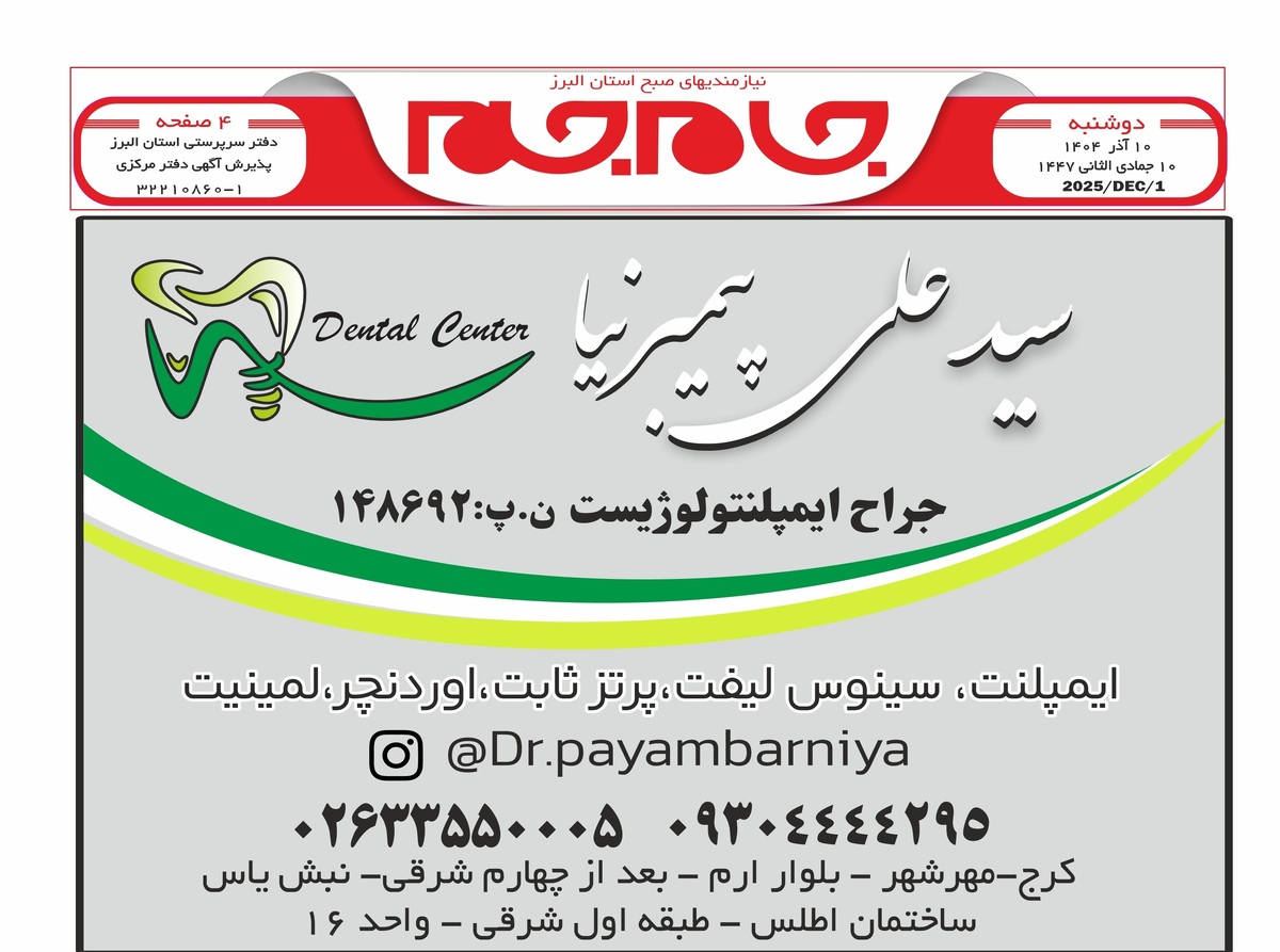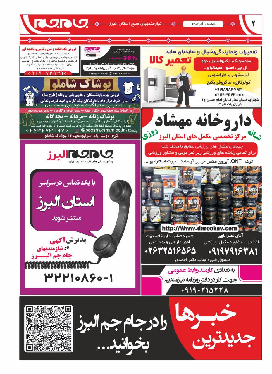نیازمندی‌های روزنامه جام جم البرز ۱۰ آذر ماه ۱۴۰۴