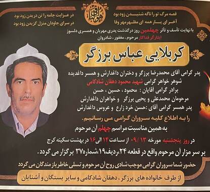 به همین مناسبت مراسم چهلم آن مرحوم در روز پنج شنبه مورخه ۱۳/۹/۱۴۰۴ از ساعت ۱۴ الی ۱۶ در بهشت سکینه کرج بر سر مزار آن مرحوم واقع در قطعه ۲۴ ردیف ۱۹ شماره ۳۷ برگزار میگردد.