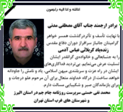 پیام تسلیت سرپرست روزنامه جام جم البرز در پی درگذشت جانباز دوران دفاع مقدس (کربلایی عباس آدمی)