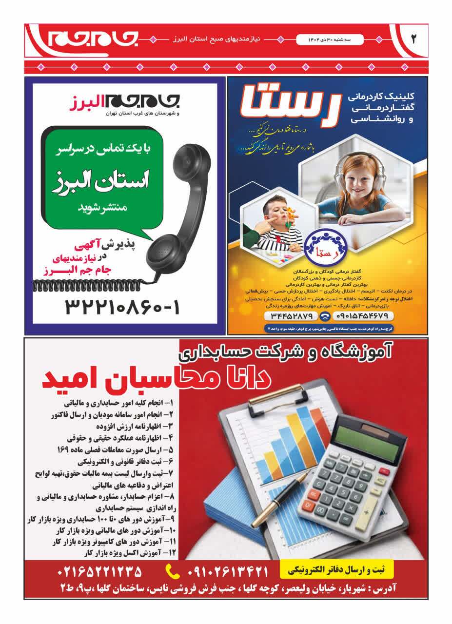 نیازمندی‌های روزنامه جام جم البرز ۳۰ دی ماه ۱۴۰۴